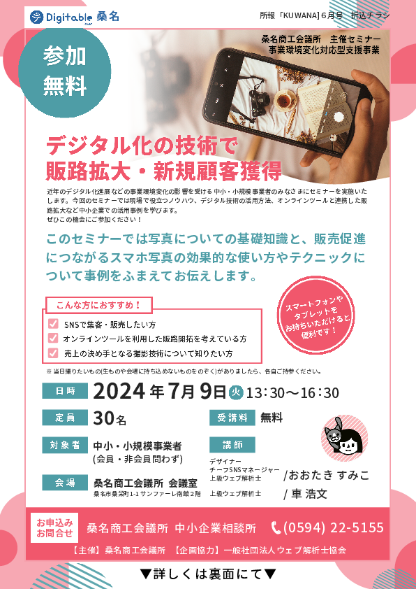 【桑名】デジタル化の技術で販路拡大・新規顧客獲得 2024年7月14日 最終更新日時 : 2025年4月23日 izuizu 開催概要 総武・採用担当の方におすすめ セミナー内容 近年のデジタル化進展などの事業環境変化の影響を受ける中小・小規模事業者のみなさまにセミナーを実施いたします。今回のセミナーでは現場で役立つノウハウ、デジタル技術の活用方法、オンラインツールと連携した販路拡大など中小企業での活用事例を学びます。 開催期間2024年7月9日(火) 13時30分 〜 16時30分開催場所桑名商工会議所 会議室参加費無料定員各回 30名主催桑名商工会議所 チラシダウンロードPDF:1.3MB このセミナーに関するお問い合わせ 桑名商工会議所 中小企業相談所 TEL:0594-22-5155